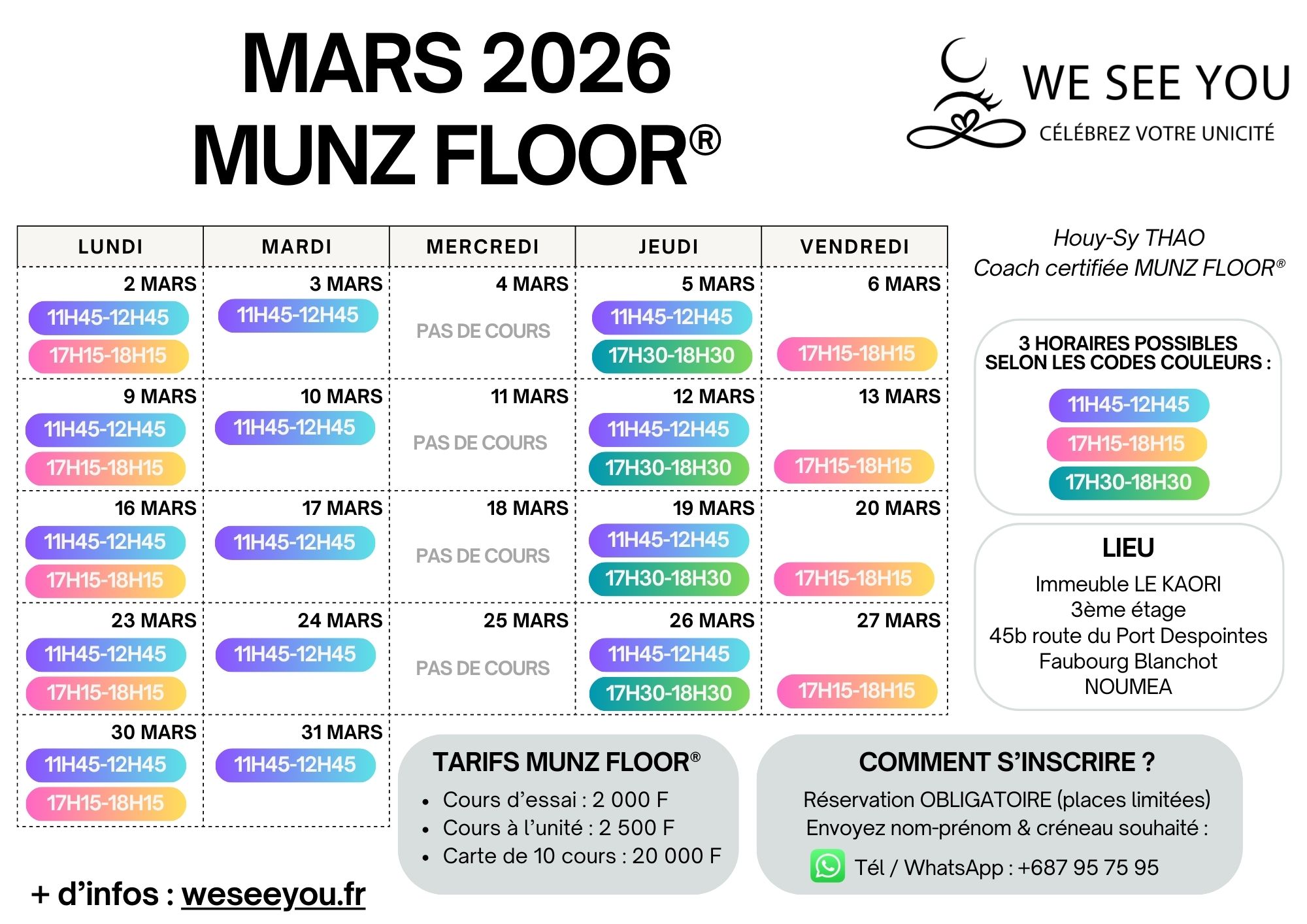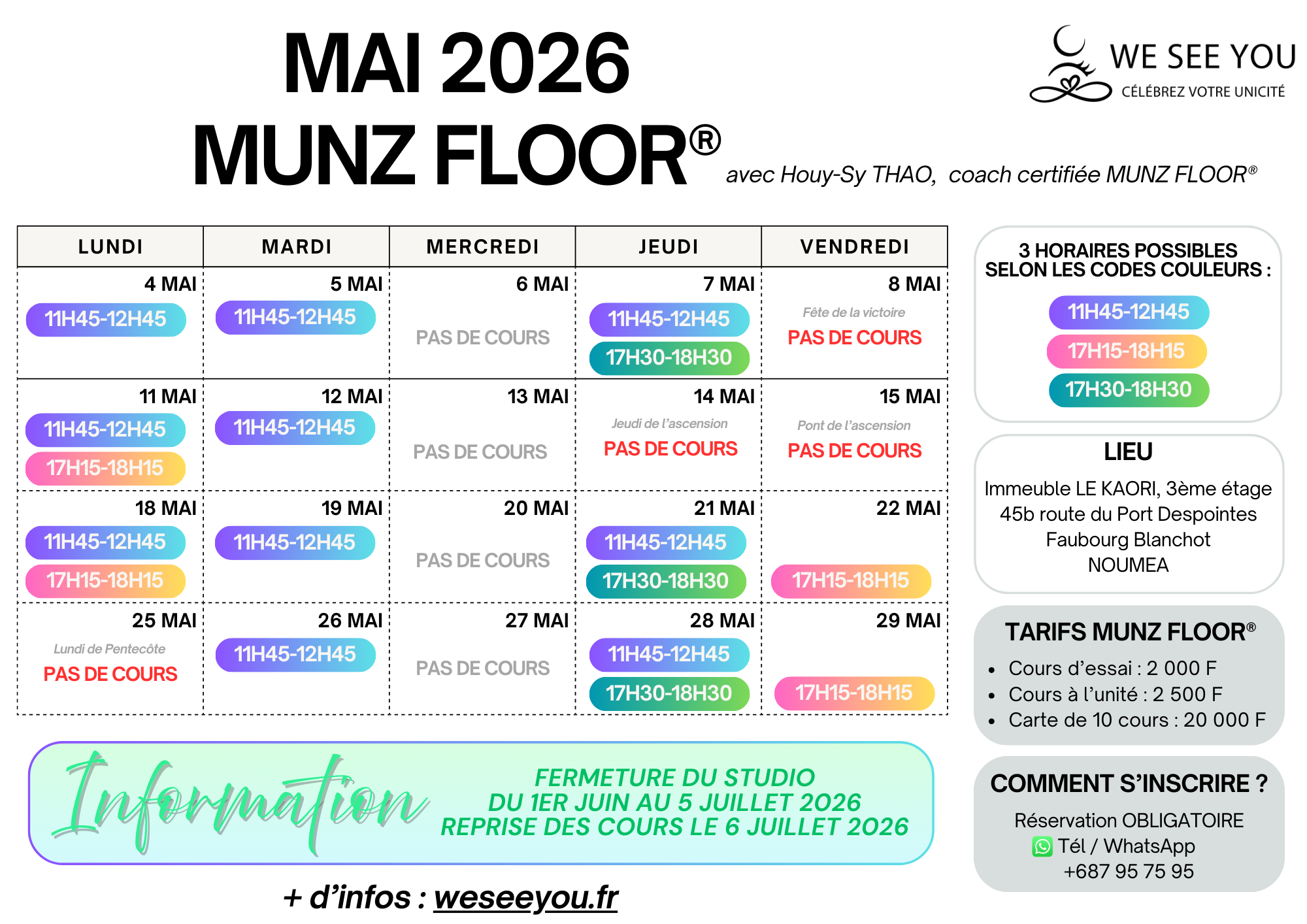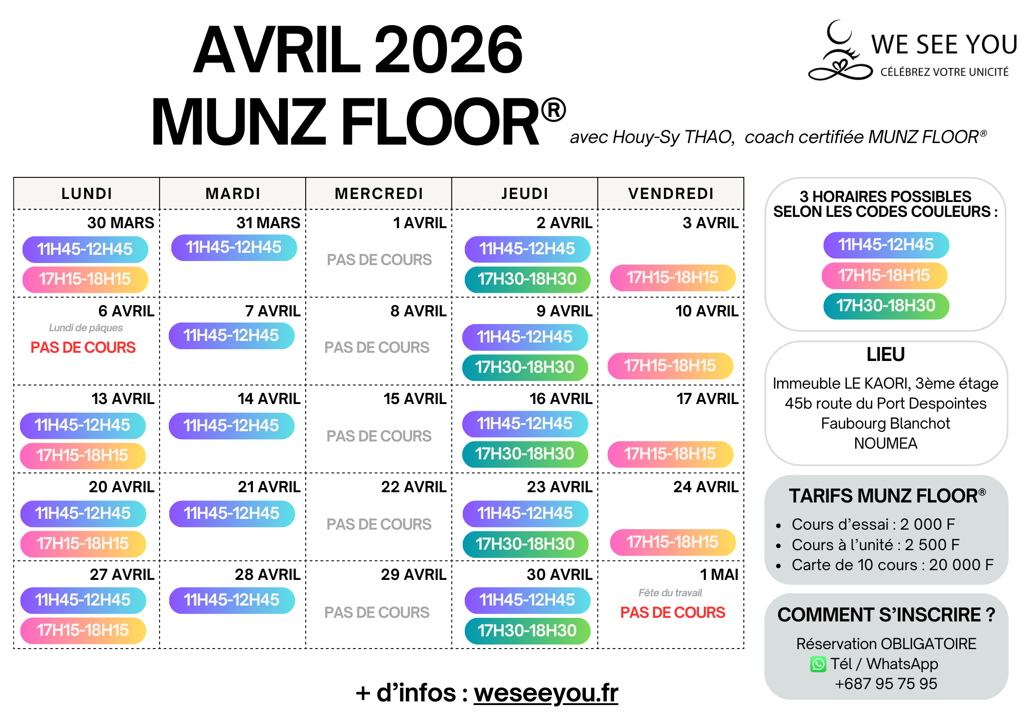Pour l’instant, seuls les cours de MUNZ FLOOR® sont proposés dans le planning des cours collectifs. Actuellement nous proposons les cours de yoga-sophrologie en séance privée uniquement (en individuel ou en groupe), mais nous pourrons en organiser en cours collectif selon vos envies. 🌸 Si cela vous appelle, n’hésitez pas à nous le faire savoir.